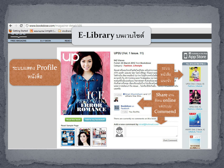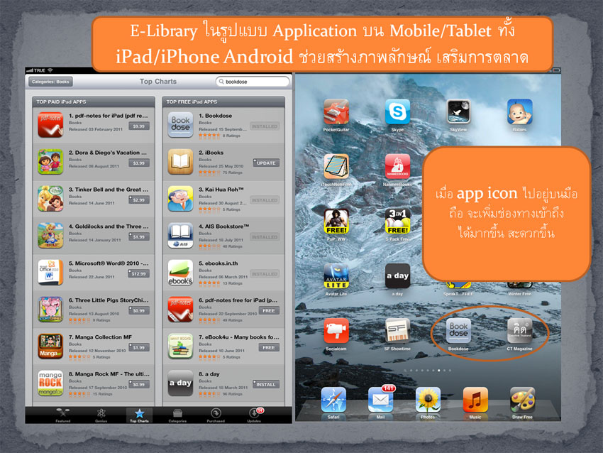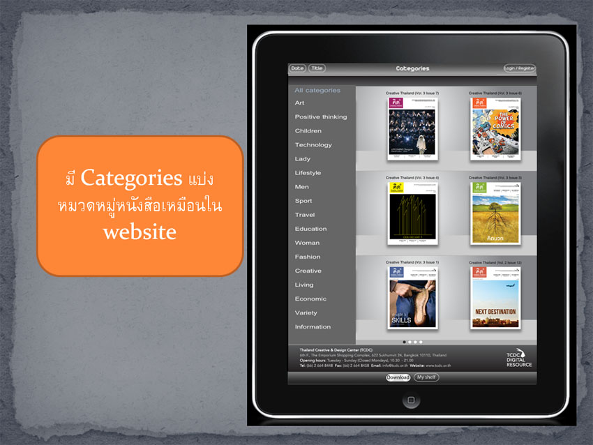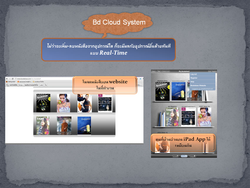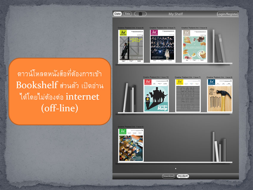 " ระบบห้องสมุดอิเล็คอทรอนิคส์ ที่จะมีหน้าชั้นวางหนังสือจำลอง ที่แบ่งหมวดหมู่หนังสือตามต้องการ สามารถเปิดอ่าน E-Book แต่ละเล่มได้ทันทีบนทุกอุปกรณ์ทั้ง iPad iPhone Android คอมพิวเตอร์ แล็ปท็อป หรือจะดาวน์โหลดมาอ่านก็ทำได้ "
