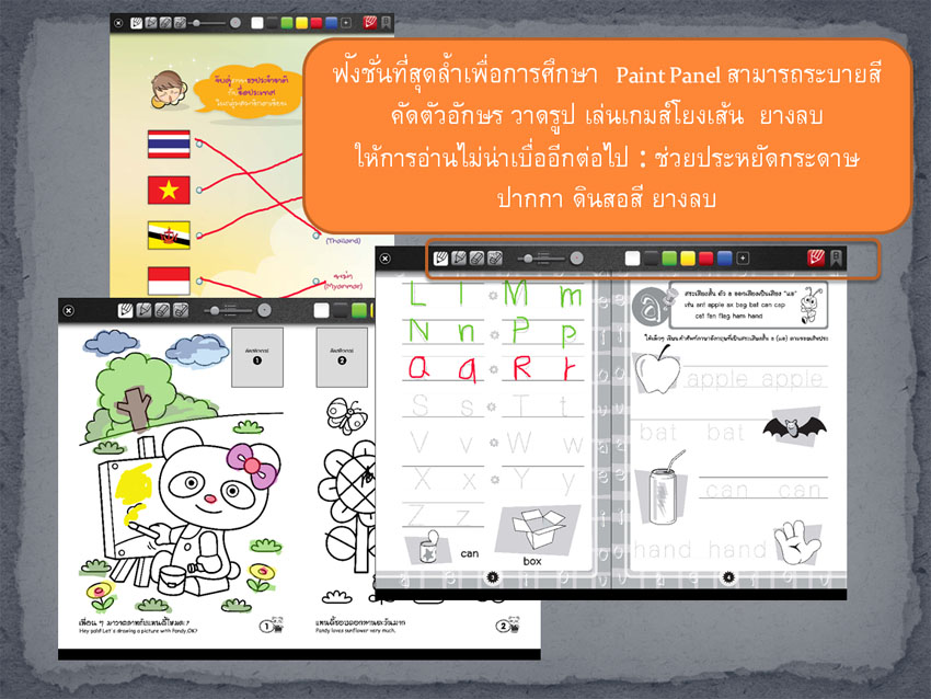 - ผู้ใช้บน Application สามารถวาด ขีด เขียน ระบายสี จดบันทึก ได้บนหน้าอ่านทุกเล่มทุกหน้า